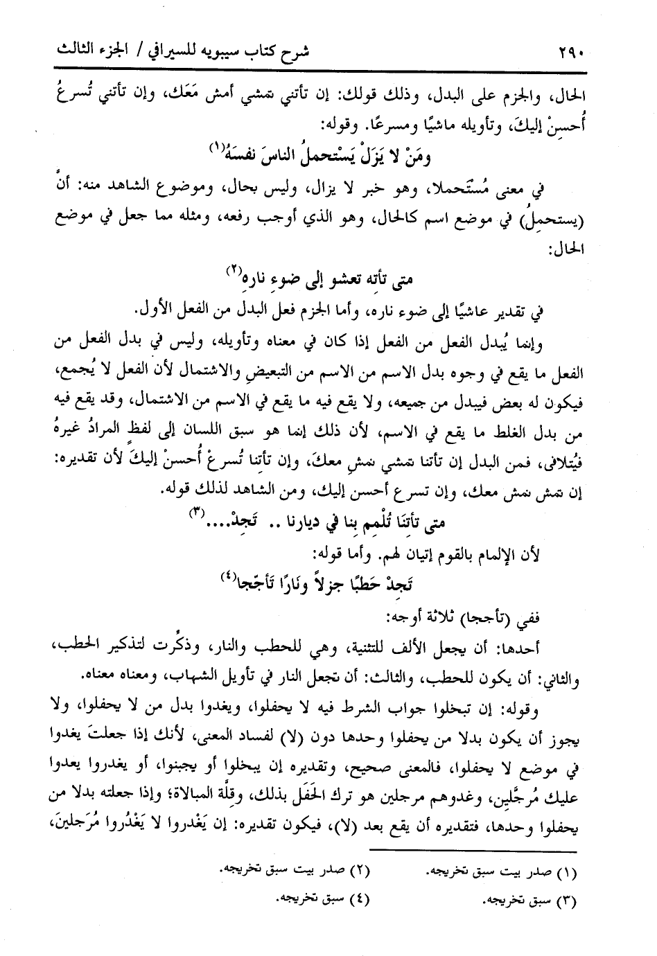 وإنما يبدل الفعل من الفعل إذا كان في معناه وتأويله، وليس في بدل الفعل من الفعل ما يقع في وجوه بدل الاسم من الاسم من التبعيض والاشتمال لأن الفعل لا يجمع، فيكون له بعض فيبدل من جميعه، ولا يقع فيه ما يقع في الاسم من الاشتمال، وقد يقع فيه من بدل الغلط ما يقع في الاسم، لأن ذلك إنما هو سبق اللسان إلى لفظ المراد غيره فيتلافى، فمن البدل إن تأتنا تمشي نمش معك، وإن تأتنا تسرع أحسن إليك لأن تقديره: