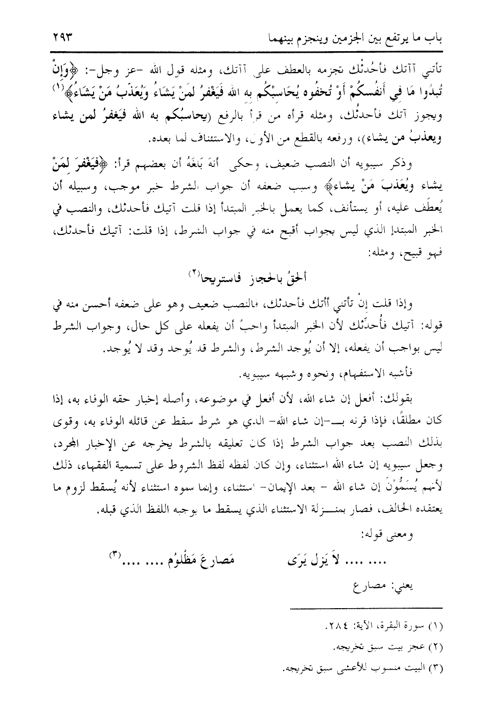 بقولك: أفعل إن شاء الله، لأن أفعل في موضوعه، وأصله إخبار حقه الوفاء به، إذا كان مطلقا، فإذا قرنه ب- إن شاء الله- الذي هو شرط سقط عن قائله الوفاء به، وقوى بذلك النصب بعد جواب الشرط إذا كان تعليقه بالشرط يخرجه عن الإخبار المجرد، وجعل سيبويه إن شاء الله استثناء، وإن كان لفظه لفظ الشروط على تسمية الفقهاء، ذلك لأنهم يسمّون إن شاء الله- بعد الإيمان- استثناء، وإنما سموه استثناء لأنه يسقط لزوم ما يعتقده الحالف، فصار بمنزلة الاستثناء الذي يسقط ما يوجبه اللفظ الذي قبله.