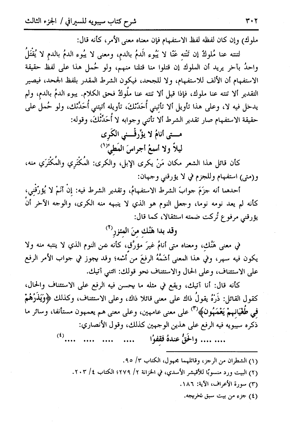في معنى هنك، ومعناه متى أنام غير مؤرّق، كأنه تمن النوم الذي لا ينتبه منه ولا يكون فيه سهر، وفي هذا المعنى أشمّه الرفع من أشمه؛ وقد يجوز في جواب الأمر الرفع على الاستئناف، وعلى الحال والاستئناف نحو قولك: ائتني آتيك.