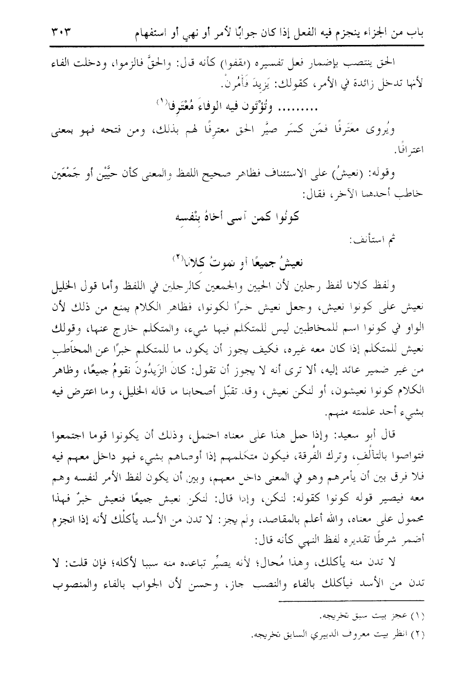 قال أبو سعيد: وإذا حمل هذا على معناه احتمل، وذلك أن يكونوا قوما اجتمعوا فتواصوا بالتآلف، وترك الفرقة، فيكون متكلمهم إذا أوصاهم بشيء فهو داخل معهم فيه فلا فرق بين أن يأمرهم وهو في المعنى داخل معهم، وبين أن يكون لفظ الأمر لنفسه وهم معه فيصير قوله كونوا كقوله: لنكن، وإذا قال: لنكن نعيش جميعا فنعيش خبر فهذا محمول على معناه، والله أعلم بالمقاصد، ولم يجز: لا تدن من الأسد يأكلك لأنه إذا انجزم أضمر شرطا تقديره لفظ النهي كأنه قال: