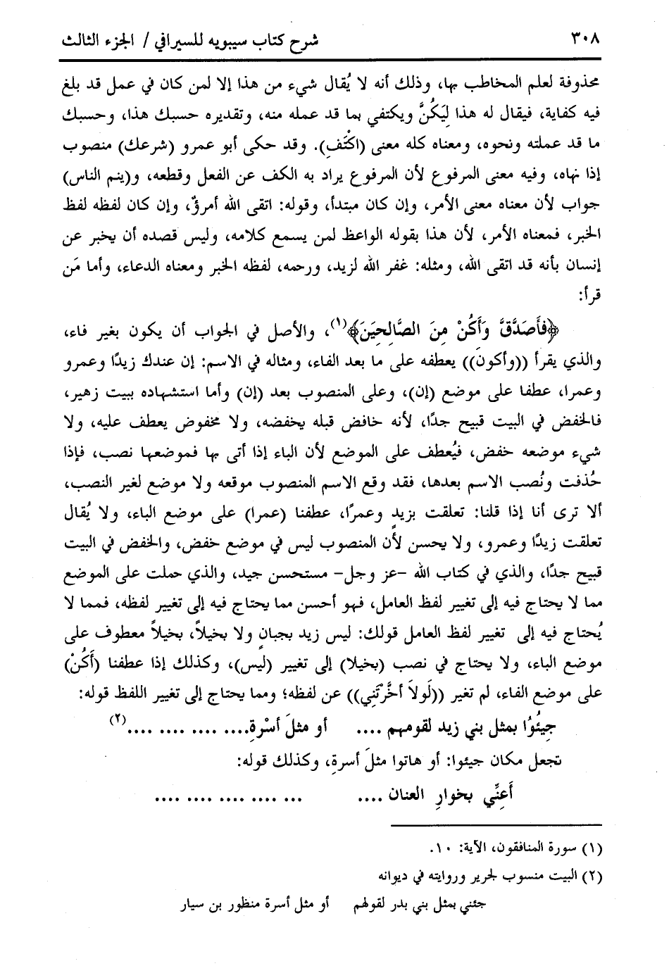 فَأَصَّدَّقَ وَأَكُنْ مِنَ الصَّالِحِينَ (¬1)، والأصل في الجواب أن يكون بغير فاء، والذي يقرأ ((وأكون)) يعطفه على ما بعد الفاء، ومثاله في الاسم: إن عندك زيدا وعمرو وعمرا، عطفا على موضع (إن)، وعلى المنصوب بعد (إن) وأما استشهاده ببيت زهير، فالخفض في البيت قبيح جدا، لأنه خافض قبله يخفضه، ولا مخفوض يعطف عليه، ولا شيء موضعه خفض، فيعطف على الموضع لأن الباء إذا أتى بها فموضعها نصب، فإذا حذفت ونصب الاسم بعدها، فقد وقع الاسم المنصوب موقعه ولا موضع لغير النصب، ألا ترى أنا إذا قلنا: تعلقت بزيد وعمرا، عطفنا (عمرا) على موضع الباء، ولا يقال تعلقت زيدا وعمرو، ولا يحسن لأن المنصوب ليس في موضع خفض، والخفض في البيت قبيح جدا، والذي في كتاب الله- عز وجل- مستحسن جيد، والذي حملت على الموضع مما لا يحتاج فيه إلى تغيير لفظ العامل، فهو أحسن مما يحتاج فيه إلى تغيير لفظه، فمما لا يحتاج فيه إلى تغيير لفظ العامل قولك: ليس زيد بجبان ولا بخيلا، بخيلا معطوف على موضع الباء، ولا يحتاج في نصب (بخيلا) إلى تغيير (ليس)، وكذلك إذا عطفنا (أكن) على موضع الفاء، لم تغير ((لولا أخّرتني)) عن لفظه؛ ومما يحتاج إلى تغيير اللفظ قوله: