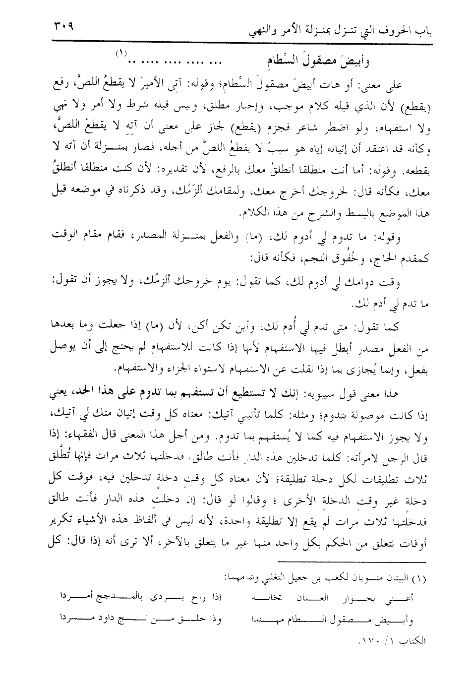 هذا معنى قول سيبويه: إنك لا تستطيع أن تستفهم بما تدوم على هذا الحد، يعني إذا كانت موصولة بتدوم؛ ومثله: كلما تأتيني آتيك: معناه كل وقت إتيان منك لي آتيك، ولا يجوز الاستفهام فيه كما لا يستفهم بما تدوم. ومن أجل هذا المعنى قال الفقهاء: إذا قال الرجل لامرأته: كلما تدخلين هذه الدار فأنت طالق، فدخلتها ثلاث مرات فإنها تطّلق ثلاث تطليقات لكل دخلة تطليقة؛ لأن معناه كل وقت دخلة تدخلين فيه، فوقت كل دخلة غير وقت الدخلة الأخرى؛ وقالوا لو قال: إن دخلت هذه الدار فأنت طالق فدخلتها ثلاث مرات لم يقع إلا تطليقة واحدة، لأنه ليس في ألفاظ هذه الأشياء تكرير أوقات تتعلق من الحكم بكل واحد منها غير ما يتعلق بالآخر، ألا ترى أنه إذا قال: كل