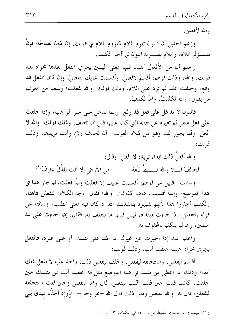 واعلم أن من الأفعال أشياء فيها معنى اليمين يجري الفعل بعدها مجراه بعد قولك: والله، وذلك قولهم: أقسم لأفعلنّ، وأقسمت عليك لتفعلنّ، وإن كان الفعل قد وقع، وحلفت عليه لم تزد على اللام، وذلك قولك: والله لفعلت؛ وسمعنا من العرب من يقول: والله لكذبتّ، والله لكذب.