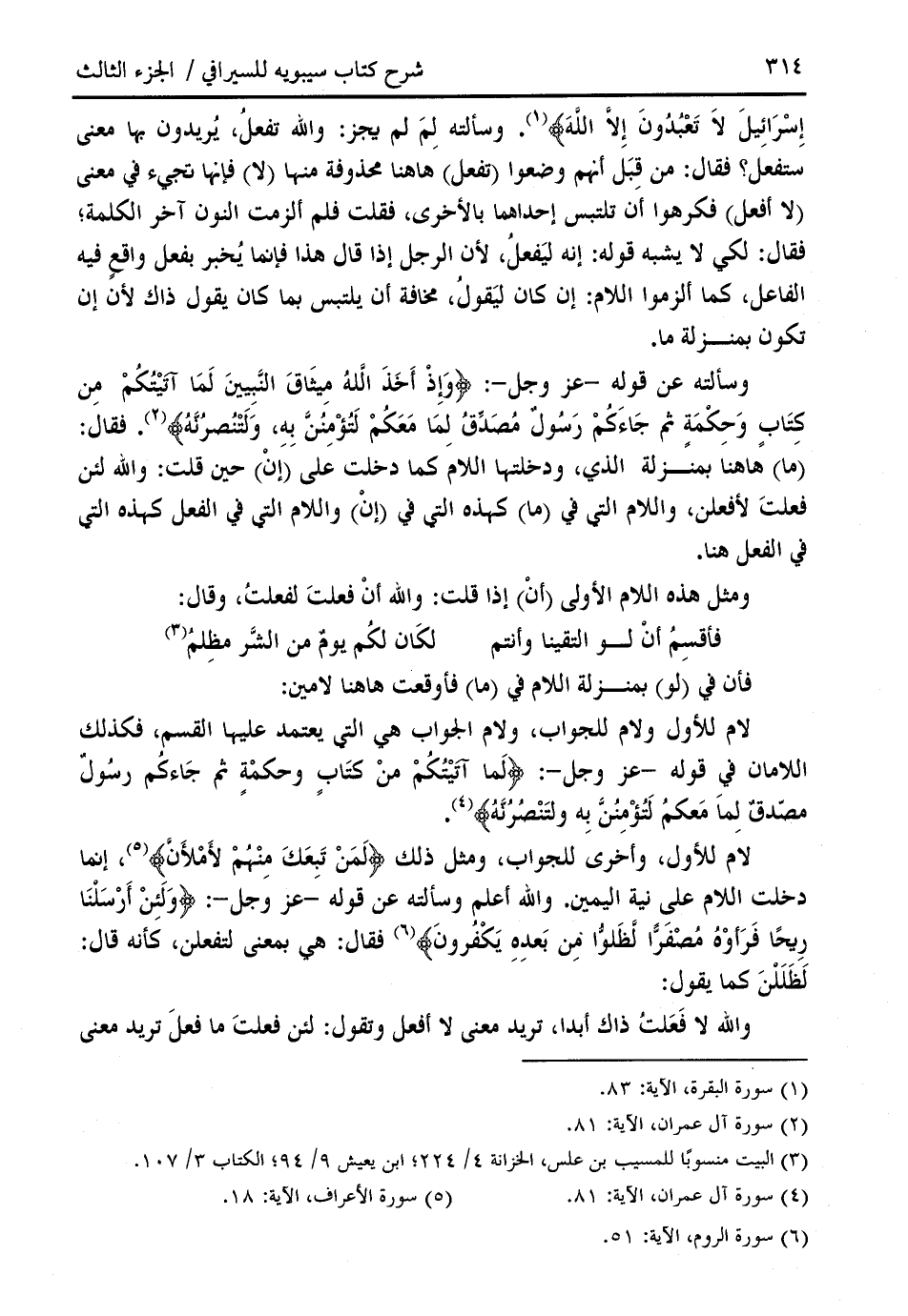 إِسْرائِيلَ لا تَعْبُدُونَ إِلَّا اللَّهَ (¬1). وسألته لم لم يجز: والله تفعل، يريدون بها معنى ستفعل؟ فقال: من قبل أنهم وضعوا (تفعل) هاهنا محذوفة منها (لا) فإنها تجيء في معنى (لا أفعل) فكرهوا أن تلتبس إحداهما بالأخرى، فقلت فلم ألزمت النون آخر الكلمة؛ فقال: لكي لا يشبه قوله: إنه ليفعل، لأن الرجل إذا قال هذا فإنما يخبر بفعل واقع فيه الفاعل، كما ألزموا اللام: إن كان ليقول، مخافة أن يلتبس بما كان يقول ذاك لأن إن تكون بمنزلة ما.