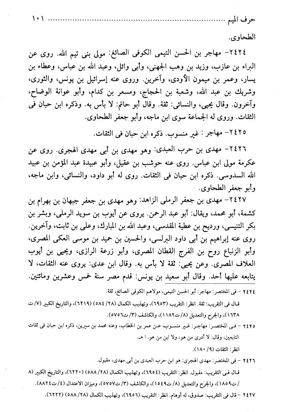 2426 - مهدى بن حرب العبدى: وهو مهدى بن أبى مهدى الهجرى. روى عن عكرمة مولى ابن عباس. روى عنه حوشب بن عقيل، وأبو عبيدة عبد المؤمن بن عبيد الله السدوسى. ذكره ابن حبان فى الثقات. روى له أبو داود، والنسائى، وابن ماجه، وأبو جعفر الطحاوى.