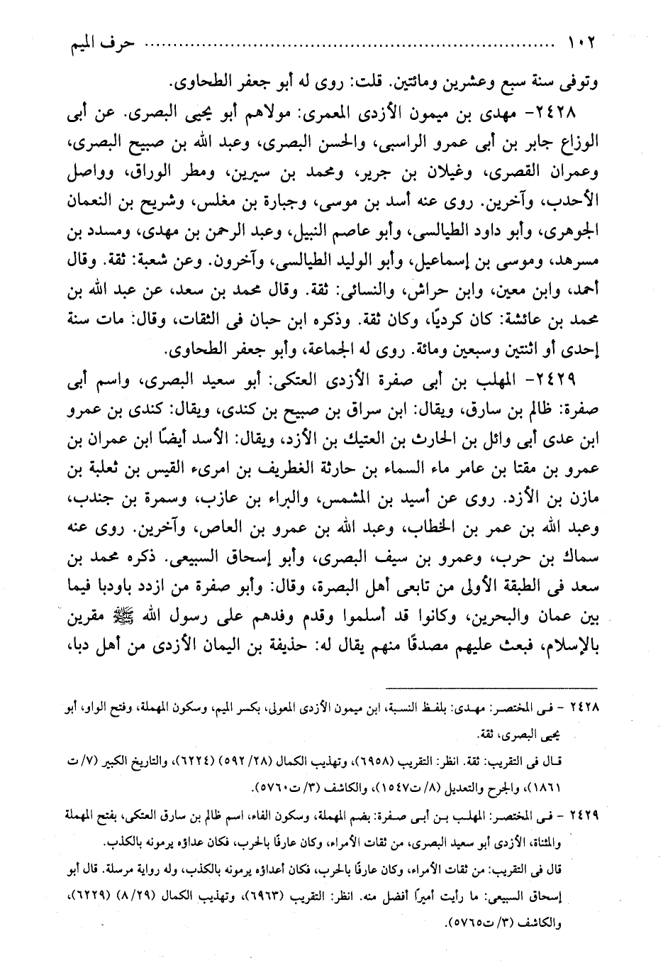 2428 - فى المختصر: مهدى: بلفظ النسبة، ابن ميمون الأزدى المعولى، بكسر الميم، وسكون المهملة، وفتح الواو، أبو يحيى البصرى، ثقة.