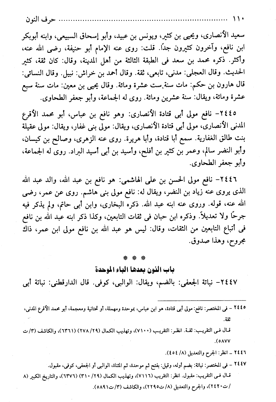 2445 - فى المختصر: نافع: مولى أبى قتادة، هو ابن عباس، بموحدة ومهملة، أو تحتانية ومعجمة، أبو محمد الأقرع المدنى، ثقة.