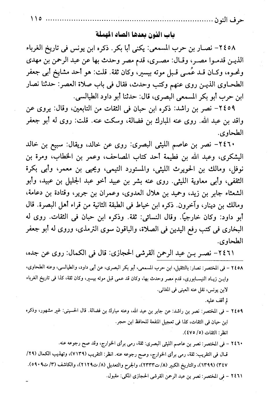 2459 - نصر بن راشد: ذكره ابن حبان فى الثقات من التابعين، وقال: يروى عن واقد بن عبد الله. روى عنه المبارك بن فضالة، وسكت عنه. قلت: روى له أبو جعفر الطحاوى.