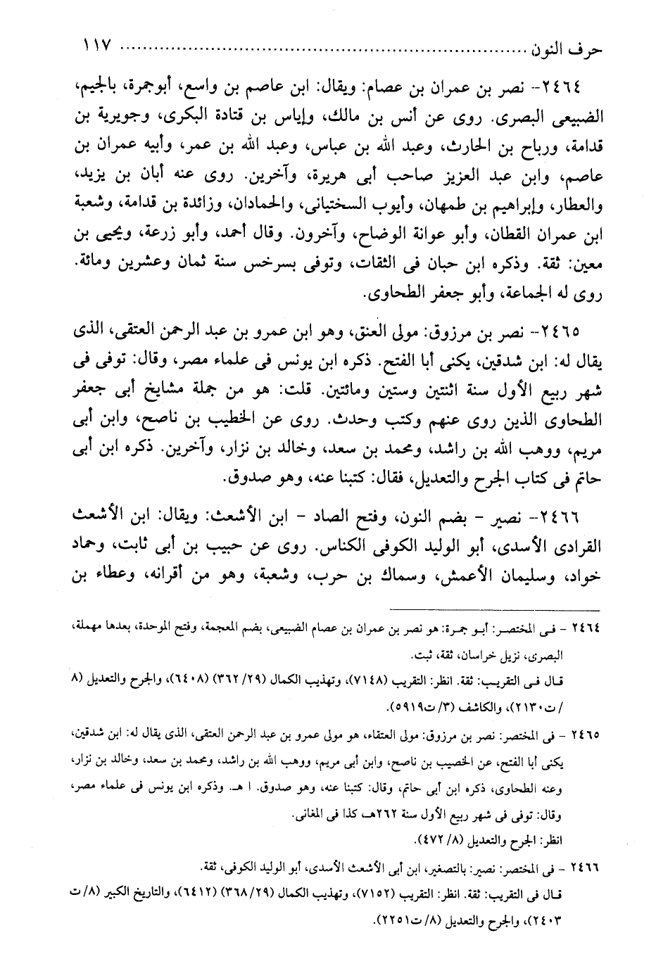 2464 - نصر بن عمران بن عصام: ويقال: ابن عاصم بن واسع، أبوجمرة، بالجيم، الضبيعى البصرى. روى عن أنس بن مالك، وإياس بن قتادة البكرى، وجويرية بن قدامة، ورباح بن الحارث، وعبد الله بن عباس، وعبد الله بن عمر، وأبيه عمران بن عاصم، وابن عبد العزيز صاحب أبى هريرة، وآخرين. روى عنه أبان بن يزيد، والعطار، وإبراهيم بن طمهان، وأيوب السختيانى، والحمادان، وزائدة بن قدامة، وشعبة ابن عمران القطان، وأبو عوانة الوضاح، وآخرون. وقال أحمد، وأبو زرعة، ويحيى بن معين: ثقة. وذكره ابن حبان فى الثقات، وتوفى بسرخس سنة ثمان وعشرين ومائة. روى له الجماعة، وأبو جعفر الطحاوى.