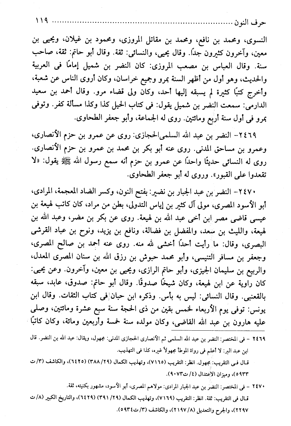 2469 - النضر بن عبد الله السلمىالحجازى: روى عن عمرو بن حزم الأنصارى، وعمرو بن مساحق المدنى. روى عنه أبو بكر بن محمد بن عمرو بن حزم الأنصارى. روى له النسائى حديثًا واحدًا عن عمرو بن حزم أنه سمع رسول الله - صلى الله عليه وسلم - يقول: "لا تقعدوا على القبور". وروى له أبو جعفر الطحاوى.