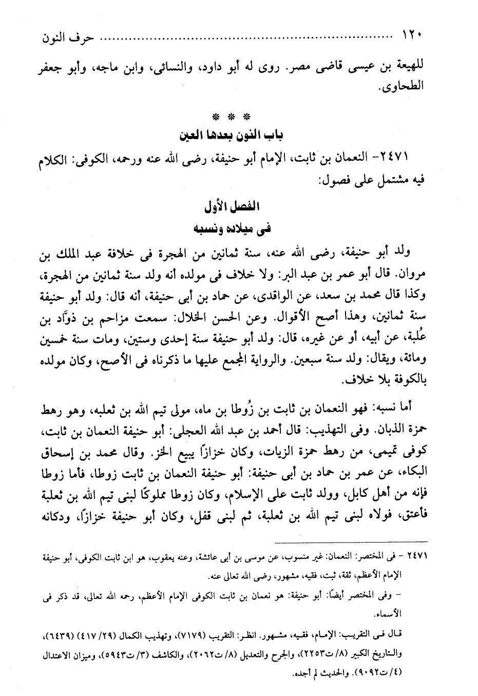 2471 - النعمان بن ثابت، الإمام أبو حنيفة، رضى الله عنه ورحمه، الكوفى: الكلام فيه مشتمل على فصول: