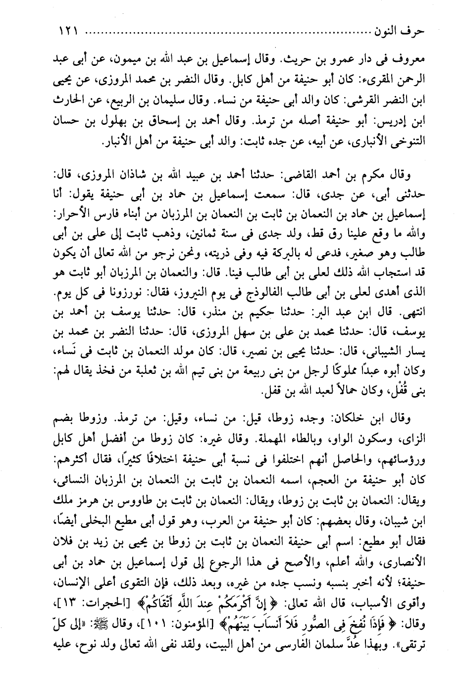 وقال ابن خلكان: وجده زوطا، قيل: من نساء، وقيل: من ترمذ. وزوطا بضم الزاى، وسكون الواو، وبالطاء المهملة. وقال غيره: كان زوطا من أفضل أهل كابل ورؤسائهم، والحاصل أنهم اختلفوا فى نسبة أبى حنيفة اختلافًا كثيرًا، فقال أكثرهم: كان أبو حنيفة من العجم، اسمه النعمان بن ثابت بن النعمان بن المرزبان النسائى، ويقال: النعمان بن ثابت بن زوطا، ويقال: النعمان بن ثابت بن طاووس بن هرمز ملك بن شيبان، وقال بعضهم: كان أبو حنيفة من العرب، وهو قول أبى مطيع البخلى أيضًا، فقال أبو مطيع: اسم أبى حنيفة النعمان بن ثابت بن زوطا بن يحيى بن زيد بن فلان الأنصارى، والله أعلم، والأصح فى هذا الرجوع إلى قول إسماعيل بن حماد بن أبى حنيفة؛ لأنه أخبر بنسبه ونسب جده من غيره، وبعد ذلك، فإن التقوى أعلى الإنسان، وأقوى الأسباب، قال الله تعالى: {إِنَّ أَكْرَمَكُمْ عِندَ اللَّهِ أَتْقَاكُمْ} [الحجرات: 13] ، وقال: {فَإِذَا نُفِخَ فِى الصُّورِ فَلاَ أَنسَابَ بَيْنَهُمْ} [المؤمنون: 101] ، وقال - صلى الله عليه وسلم -: "إلى كلّ ترتقى". وبهذا عُدَّ سلمان الفارسى من أهل البيت، ولقد نفى الله تعالى ولد نوح، عليه