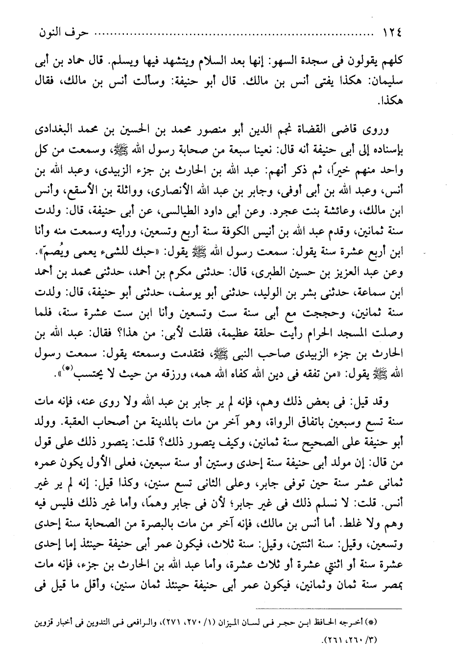 وقد قيل: فى بعض ذلك وهم، فإنه لم ير جابر بن عبد الله ولا روى عنه، فإنه مات سنة تسع وسبعين باتفاق الرواة، وهو آخر من مات بالمدينة من أصحاب العقبة. وولد أبو حنيفة على الصحيح سنة ثمانين، وكيف يتصور ذلك؟ قلت: يتصور ذلك على قول من قال: إن مولد أبى حنيفة سنة إحدى وستين أو سنة سبعين، فعلى الأول يكون عمره ثمانى عشر سنة حين توفى جابر، وعلى الثانى تسع سنين، وكذا قيل: إنه لم ير غير أنس. قلت: لا نسلم ذلك فى غير جابر؛ لأن فى جابر وهمًا، وأما غير ذلك فليس فيه وهم ولا غلط. أما أنس بن مالك، فإنه آخر من مات بالبصرة من الصحابة سنة إحدى وتسعين، وقيل: سنة اثنتين، وقيل: سنة ثلاث، فيكون عمر أبى حنيفة حينئذ إما أحد عشر سنة أو اثنى عشر أو ثلاث عشرة، وأما عبد الله بن الحارث بن جزء، فإنه مات بمصر سنة ثمان وثمانين، فيكون عمر أبى حنيفة حينئذ ثمان سنين، وأقل ما قيل فى
