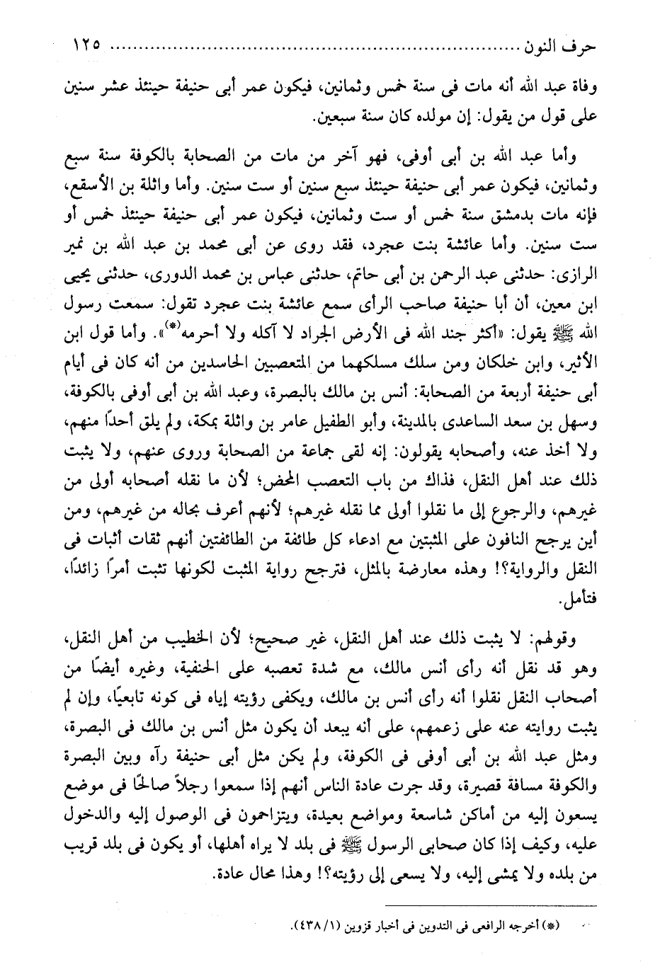 وأما عبد الله بن أبى أوفى، فهو آخر من مات من الصحابة بالكوفة سنة سبع وثمانين، فيكون عمر أبى حنيفة حينئذ سبع سنين أو ست سنين. وأما واثلة بن الأسقع، فإنه مات بدمشق سنة خمس أو ست وثمانين، فيكون عمر أبى حنيفة حينئذ خمس أو ست سنين. وأما عائشة بنت عجرد، فقد روى عن أبى محمد بن عبد الله بن نمير الرازى: حدثنى عبد الرحمن بن أبى حاتم، حدثنى عباس بن محمد الدورى، حدثنى يحيى ابن معين، أن أبا حنيفة صاحب الرأى سمع عائشة بنت عجرد تقول: سمعت رسول الله - صلى الله عليه وسلم - يقول: "أكثر جند الله فى الأرض الجراد لا آكله ولا أحرمه (*) ". وأما قول ابن الأثير، وابن خلكان ومن سلك مسلكهما من المتعصبين الحاسدين من أنه كان فى أيام أبى حنيفة أربعة من الصحابة: أنس بن مالك بالبصرة، وعبد الله بن أبى أوفى بالكوفة، وسهل بن سعد الساعدى بالمدينة، وأبو الطفيل عامر بن واثلة بمكة، ولم يلق أحدًا منهم، ولا أخذ عنه، وأصحابه يقولون: إنه لقى جماعة من الصحابة وروى عنهم، ولا يثبت ذلك عند أهل النقل، فذاك من باب التعصب المحض؛ لأن ما نقله أصحابه أولى من غيرهم، والرجوع إلى ما نقلوا أولى مما نقله غيرهم؛ لأنهم أعرف بحاله من غيرهم، ومن أين يرجح النافون على المثبتين مع ادعاء كل طائفة من الطائفتين أنهم ثقات أثبات فى النقل والرواية؟! وهذه معارضة بالمثل، فترجح رواية المثبت لكونها تثبت أمرًا زائدًا، فتأمل.