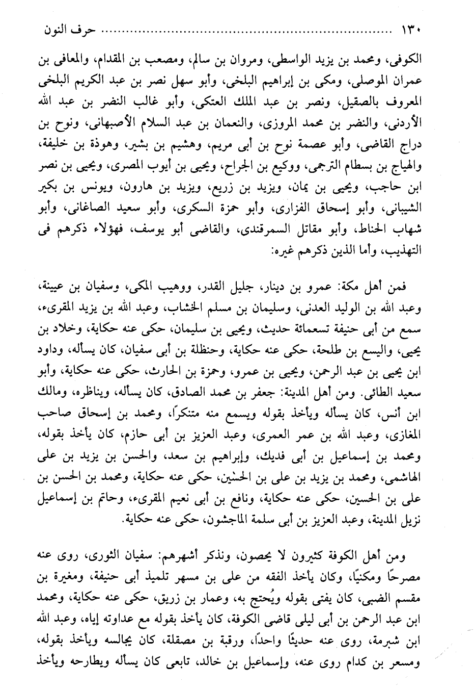 الكوفى، ومحمد بن يزيد الواسطى، ومروان بن سالم، ومصعب بن المقدام، والمعافى بن عمران الموصلى، ومكى بن إبراهيم البلخى، وأبو سهل نصر بن عبد الكريم البلخى المعروف بالصقيل، ونصر بن عبد الملك العتكى، وأبو غالب النضر بن عبد الله الأردنى، والنضر بن محمد المروزى، والنعمان بن عبد السلام الأصبهانى، ونوح بن دراج القاضى، وأبو عصمة نوح بن أبى مريم، وهشيم بن بشير، وهوذة بن خليفة، والهياج بن بسطام الترجمى، ووكيع بن الجراح، ويحيى بن أيوب المصرى، ويحيى بن نصر ابن حاجب، ويحيى بن يمان، ويزيد بن زريع، ويزيد بن هارون، ويونس بن بكير الشيبانى، وأبو إسحاق الفزارى، وأبو حمزة السكرى، وأبو سعيد الصاغانى، وأبو شهاب الحناط، وأبو مقاتل السمرقندى، والقاضى أبو يوسف، فهؤلاء ذكرهم فى التهذيب، وأما الذين ذكرهم غيره: