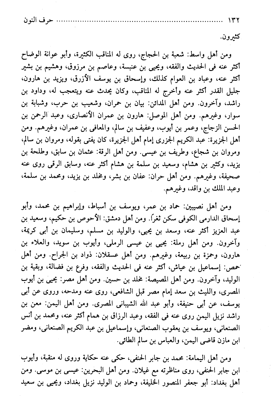 ومن أهل نصيبين: حماد بن عمر، ويوسف بن أسباط، وإبراهيم بن محمد، وأبو إسحاق الدارمى الكوفى سكن ثغرًا. ومن أهل دمشق: الأحوص بن حكيم، وسعيد بن عبد العزيز أكثر عنه، وسعد بن يحيى، والوليد بن مسلم، وسليمان بن أبى كريمة، وآخرون. ومن أهل رملة: يحيى بن عيسى الرملى، وأيوب بن سويد، والعلاء بن هارون، وحمزة بن ربيعة، وغيرهم. ومن أهل عسقلان: ذواد بن الجراح. ومن أهل حمص: إسماعيل بن عياش، أكثر عنه فى الحديث والفقه، وفرع بن فضالة، وبقية بن الوليد، وآخرون. ومن أهل المصيصة: مخلد بن حسين. ومن أهل مصر: يحيى بن أيوب المصرى، والليث بن سعد إمام مصر قبل الشافعى، روى عنه ومدحه، وروى عن أبى يوسف، عن أبى حنيفة، وأبو عبد الله الشيبانى المصرى. ومن أهل اليمن: معن بن راشد نزيل اليمن روى عنه فى الفقه، وعبد الرزاق بن همام أكثر عنه، ومحمد بن أنس الصنعانى، ويوسف بن يعقوب الصنعانى، وإسماعيل بن عبد الكريم الصنعانى، ومضر ابن مازن قاضى اليمن، والعباس بن سالم الطائى.