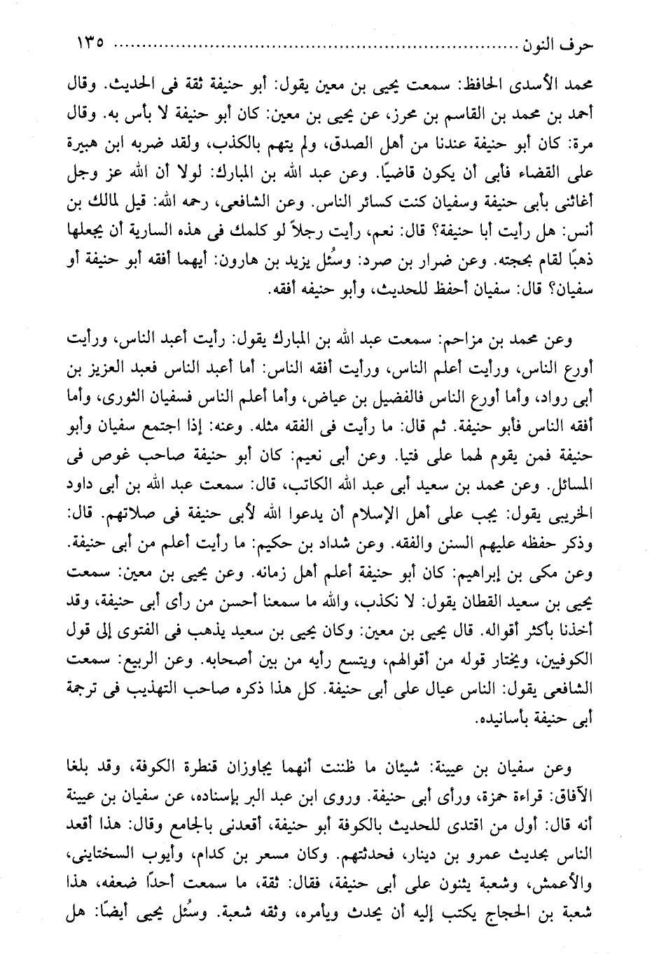 محمد الأسدى الحافظ: سمعت يحيى بن معين يقول: أبو حنيفة ثقة فى الحديث. وقال أحمد بن محمد بن القاسم بن محرز، عن يحيى بن معين: كان أبو حنيفة لا بأس به. وقال مرة: كان أبو حنيفة عندنا من أهل الصدق، ولم يتهم بالكذب، ولقد ضربه ابن هبيرة على القضاء فأبى أن يكون قاضيًا. وعن عبد الله بن المبارك: لولا أن الله عز وجل أغاثنى بأبى حنيفة وسفيان كنت كسائر الناس. وعن الشافعى، رحمه الله: قيل لمالك بن أنس: هل رأيت أبا حنيفة؟ قال: نعم، رأيت رجلاً لو كلمك فى هذه السارية أن يجعلها ذهبًا لقام بحجته. وعن ضرار بن صرد: وسُئل يزيد بن هارون: أيهما أفقه أبو حنيفة أو سفيان؟ قال: سفيان أحفظ للحديث، وأبو حنيفه أفقه.