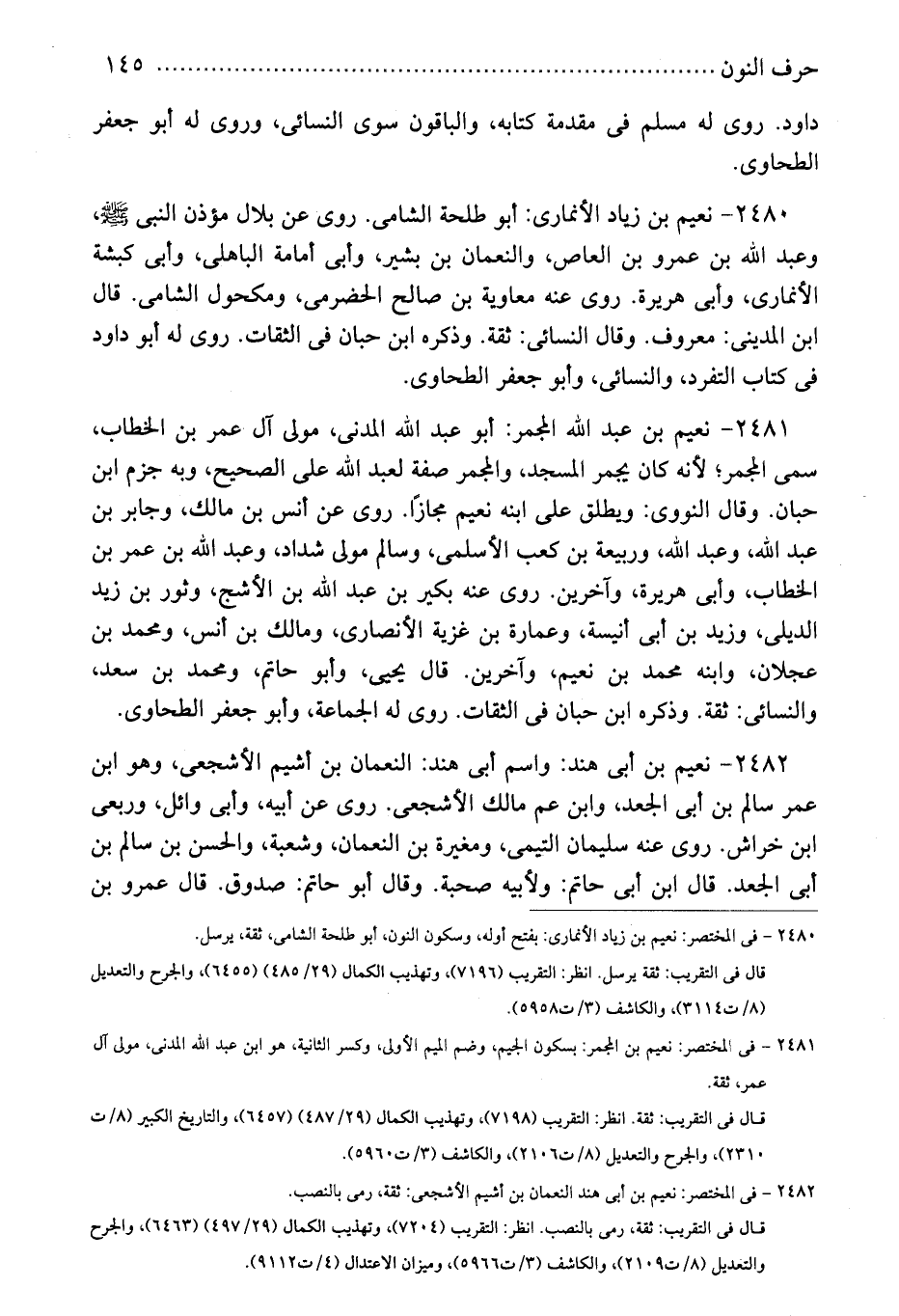 2481 - فى المختصر: نعيم بن المجمر: بسكون الجيم، وضم الميم الأولى، وكسر الثانية، هو ابن عبد الله المدنى، مولى آل عمر، ثقة.