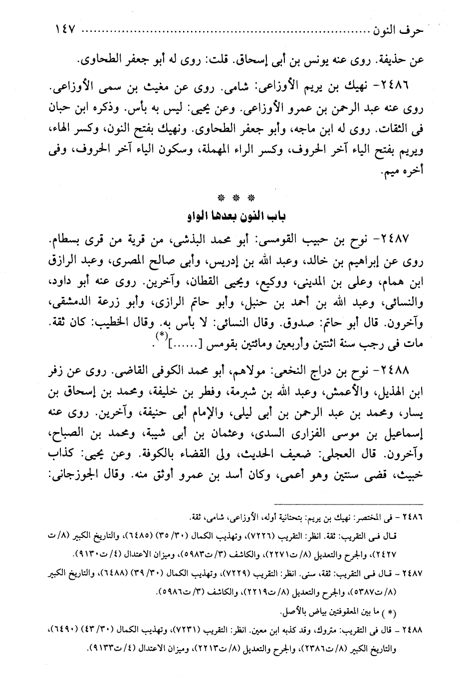 2487 - نوح بن حبيب القومسى: أبو محمد البذشى، من قرية من قرى بسطام. روى عن إبراهيم بن خالد، وعبد الله بن إدريس، وأبى صالح المصرى، وعبد الرازق ابن همام، وعلى بن المدينى، ووكيع، ويحيى القطان، وآخرين. روى عنه أبو داود، والنسائى، وعبد الله بن أحمد بن حنبل، وأبو حاتم الرازى، وأبو زرعة الدمشقى، وآخرون. قال أبو حاتم: صدوق. وقال النسائى: لا بأس به. وقال الخطيب: كان ثقة. مات فى رجب سنة اثنتين وأربعين ومائتين بقومس [......] (*) .