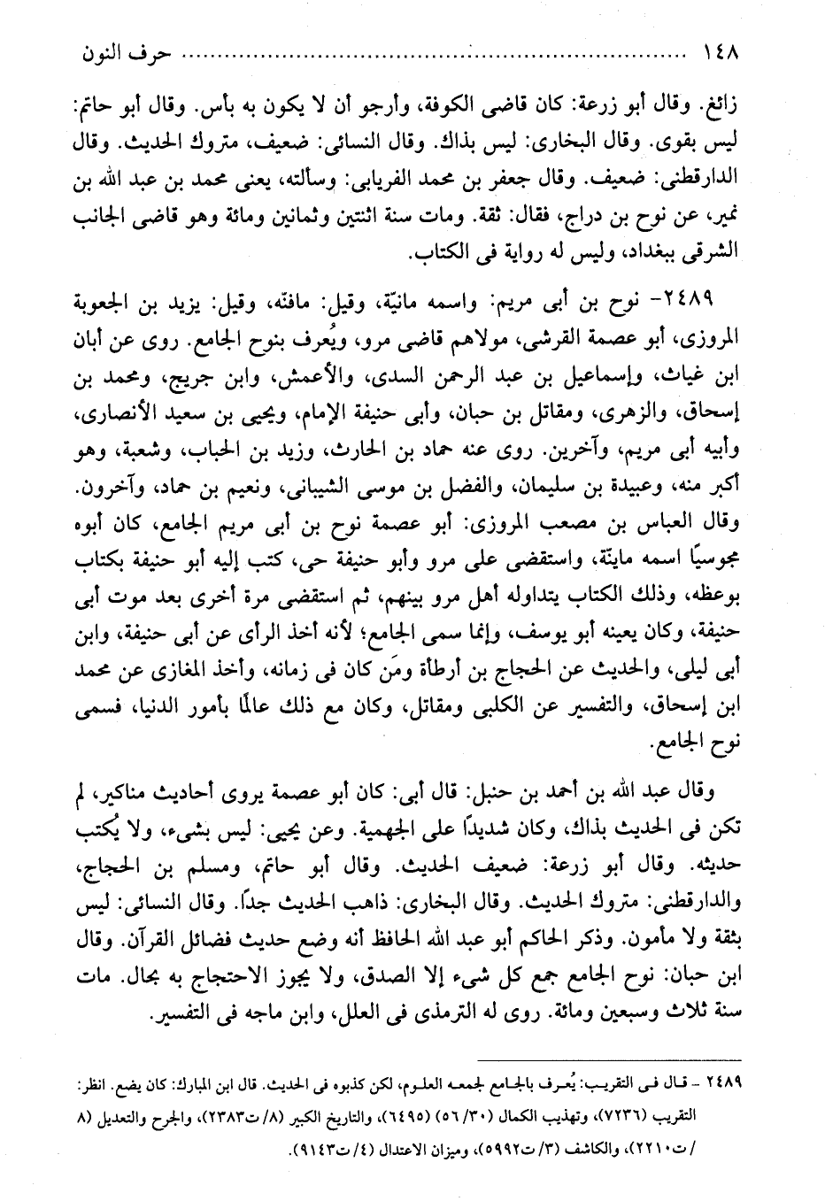 2489 - نوح بن أبى مريم: واسمه مانيّة، وقيل: مافنّه، وقيل: يزيد بن الجعوبة المروزى، أبو عصمة القرشى، مولاهم قاضى مرو، ويُعرف بنوح الجامع. روى عن أبان ابن غياث، وإسماعيل بن عبد الرحمن السدى، والأعمش، وابن جريج، ومحمد بن إسحاق، والزهرى، ومقاتل بن حبان، وأبى حنيفة الإمام، ويحيى بن سعيد الأنصارى، وأبيه أبى مريم، وآخرين. روى عنه حماد بن الحارث، وزيد بن الحباب، وشعبة، وهو أكبر منه، وعبيدة بن سليمان، والفضل بن موسى الشيبانى، ونعيم بن حماد، وآخرون. وقال العباس بن مصعب المروزى: أبو عصمة نوح بن أبى مريم الجامع، كان أبوه مجوسيًا اسمه ماينّة، واستقضى على مرو وأبو حنيفة حى، كتب إليه أبو حنيفة بكتاب بوعظه، وذلك الكتاب يتداوله أهل مرو بينهم، ثم استقضى مرة أخرى بعد موت أبى حنيفة، وكان يعينه أبو يوسف، وإنما سمى الجامع؛ لأنه أخذ الرأى عن أبى حنيفة، وابن أبى ليلى، والحديث عن الحجاج بن أرطأة ومَن كان فى زمانه، وأخذ المغازى عن محمد ابن إسحاق، والتفسير عن الكلبى ومقاتل، وكان مع ذلك عالمًا بأمور الدنيا، فسمى نوح الجامع.