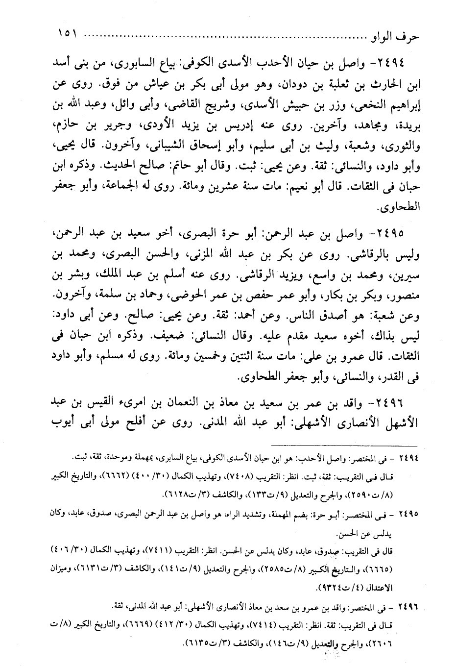 2494 - واصل بن حيان الأحدب الأسدى الكوفى: بياع السابورى، من بنى أسد ابن الحارث بن ثعلبة بن دودان، وهو مولى أبى بكر بن عياش من فوق. روى عن إبراهيم النخعى، وزر بن حبيش الأسدى، وشريج القاضى، وأبى وائل، وعبد الله بن بريدة، ومجاهد، وآخرين. روى عنه إدريس بن يزيد الأودى، وجرير بن حازم، والثورى، وشعبة، وليث بن أبى سليم، وأبو إسحاق الشيبانى، وآخرون. قال يحيى، وأبو داود، والنسائى: ثقة. وعن يحيى: ثبت. وقال أبو حاتم: صالح الحديث. وذكره ابن حبان فى الثقات. قال أبو نعيم: مات سنة عشرين ومائة. روى له الجماعة، وأبو جعفر الطحاوى.