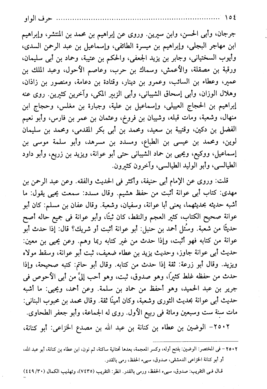 قلت: وروى عن الإمام أبى حنيفة، وأكثر فى الحديث والفقه. وعن عبد الرحمن بن مهدى: كتاب أبى عوانة أثبت من حفظ هشيم. وقال مسدد: سمعت يحيى يقول: ما أشبه حديثه بحديثهما، يعنى أبا عوانة، وسفيان، وشعبة. وقال عفان بن مسلم: كان أبو عوانة صحيح الكتاب، كثير العجم والنقط، كان ثبتًا، وأبو عوانة فى جميع حاله أصح حديثًا من شعبة. وسُئل أحمد بن حنبل: أبو عوانة أثبت أو شريك؟ قال: إذا حدث أبو عوانة من كتابه فهو أثبت، وإذا حدث من غير كتابه ربما وهم. وعن يحيى بن معين: حديث أبى عوانة جاوز، وحديث يزيد بن عطاء ضعيف، ثبت أبو عوانة، وسقط مولاه ويزيد. وقال أبو زرعة: ثقة إذا حدث من كتابه. وقال أبو حاتم: كتبه صحيحة، وإذا حدث من حفظه غلط كثيرًا، وهو صدوق، ثبت، وهو أحب إلىَّ من أبى الأحوص فى جرير بن عبد الحميد، وهو أحفظ من حماد بن سلمة. وعن أحمد، ويحيى: ما أشبه حديث أبى عوانة بحديث الثورى وشعبة، وكان أمينًا ثقة. وقال محمد بن محبوب البنانى: مات سنة ست وسبعين ومائة فى ربيع الأول. روى له الجماعة، وأبو جعفر الطحاوى.