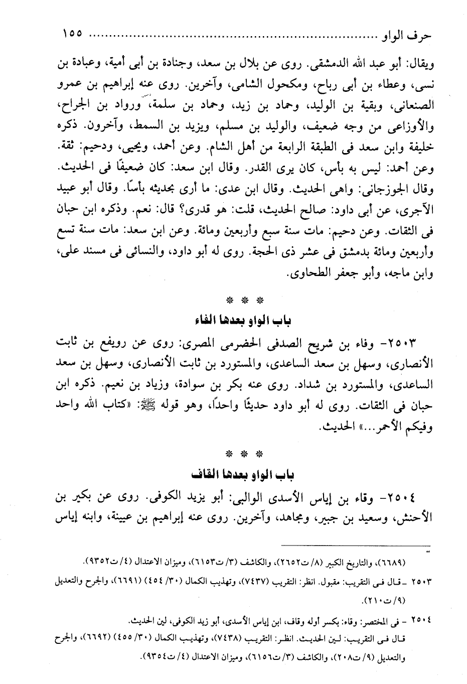 2504 - وقاء بن إياس الأسدى الوالبى: أبو يزيد الكوفى. روى عن بكير بن الأحنش، وسعيد بن جبير، ومجاهد، وآخرين. روى عنه إبراهيم بن عيينة، وابنه إياس