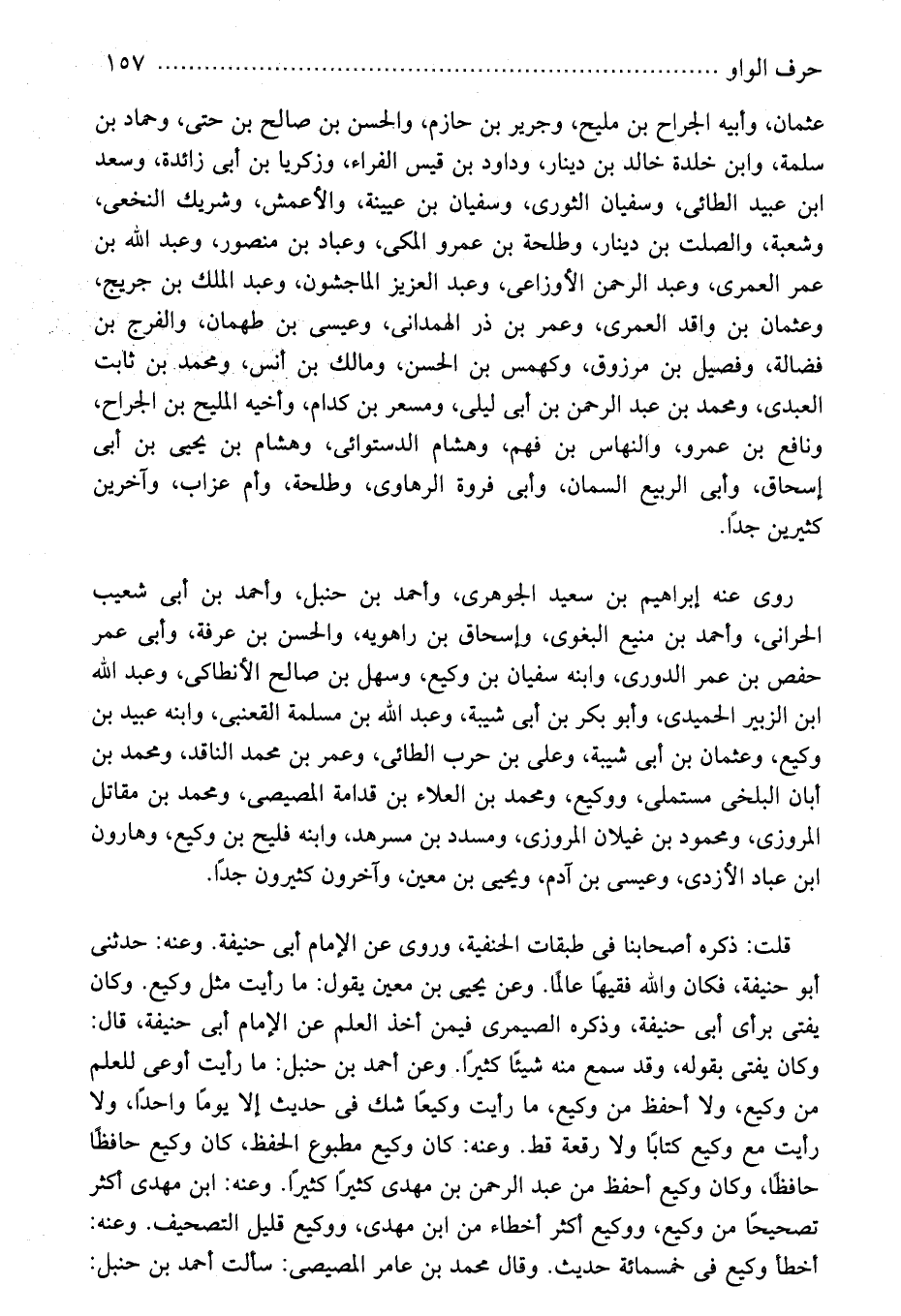 قلت: ذكره أصحابنا فى طبقات الحنفية، وروى عن الإمام أبى حنيفة. وعنه: حدثنى أبو حنيفة، فكان والله فقيهًا عالمًا. وعن يحيى بن معين يقول: ما رأيت مثل وكيع. وكان يفتى برأى أبى حنيفة، وذكره الصيمرى فيمن أخذ العلم عن الإمام أبى حنيفة، قال: وكان يفتى بقوله، وقد سمع منه شيئًا كثيرًا. وعن أحمد بن حنبل: ما رأيت أوعى للعلم من وكيع، ولا أحفظ من وكيع، ما رأيت وكيعًا شك فى حديث إلا يومًا واحدًا، ولا رأيت مع وكيع كتابًا ولا رقعة قط. وعنه: كان وكيع مطبوع الحفظ، كان وكيع حافظًا حافظًا، وكان وكيع أحفظ من عبد الرحمن بن مهدى كثيرًا كثيرًا. وعنه: ابن مهدى أكثر تصحيحًا من وكيع، ووكيع أكثر أخطاء من ابن مهدى، ووكيع قليل التصحيف. وعنه: أخطأ وكيع فى خمسمائة حديث. وقال محمد بن عامر المصيصى: سألت أحمد بن حنبل:
