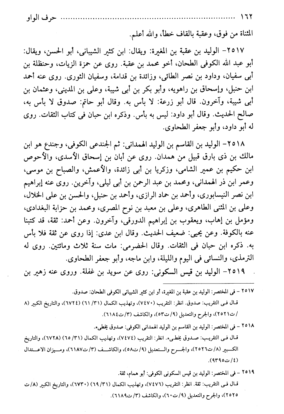 2517 - الوليد بن عقبة بن المغيرة: ويقال: ابن كثير الشيبانى، أبو الحسن، ويقال: أبو عبد الله الكوفى الطحان، أخو محمد بن عقبة. روى عن حمزة الزيات، وحنظلة بن أبى سفيان، وداود بن نصر الطائى، وزائدة بن قدامة، وسفيان الثورى. روى عنه أحمد ابن حنبل، وإسحاق بن راهويه، وأبو بكر بن أبى شيبة، وعلى بن المدينى، وعثمان بن أبى شيبة، وآخرون. قال أبو زرعة: لا بأس به. وقال أبو حاتم: صدوق لا بأس به، صالح الحديث. وقال أبو داود: ليس به بأس. وذكره ابن حبان فى كتاب الثقات. روى له أبو داود، وأبو جعفر الطحاوى.