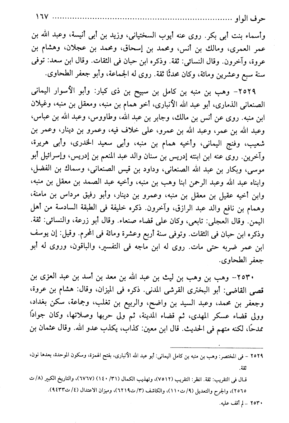 2529 - فى المختصر: وهب بن منبه بن كامل اليمانى: أبو عبد الله الأنبارى، بفتح الهمزة، وسكون الموحدة، بعدها نون، ثقة.