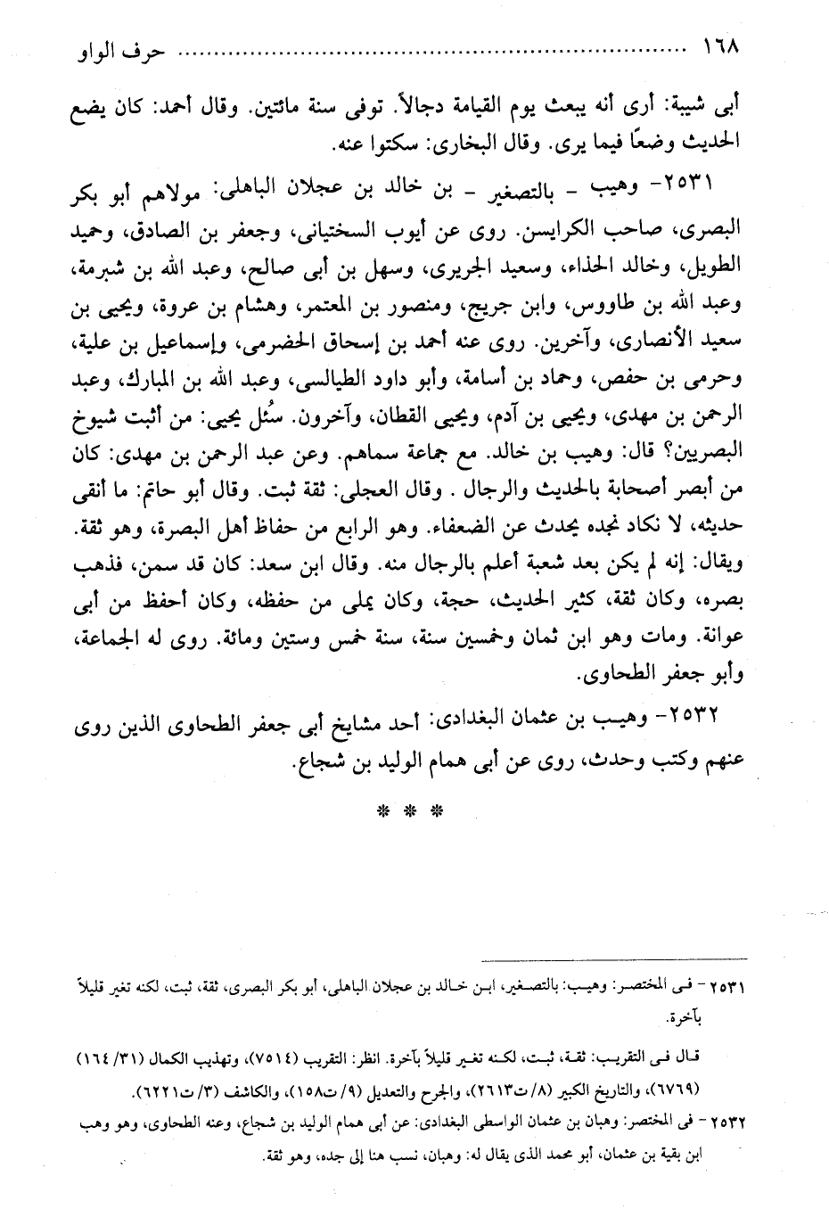2532 - وهيب بن عثمان البغدادى: أحد مشايخ أبى جعفر الطحاوى الذين روى عنهم وكتب وحدث، روى عن أبى همام الوليد بن شجاع.
