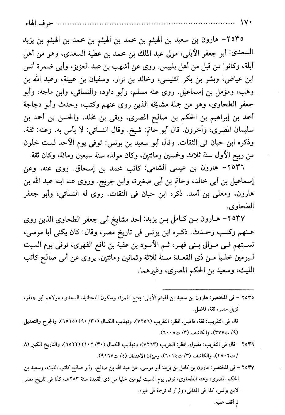 2537 - فى المختصر: هارون بن كامل بن يزيد: أبو موسى، عن عبد الله بن صالح، وأبو صالح كاتب الليث، وسعيد بن الحكم المصرى، وعنه الطحاوى، توفى يوم السبت ليومين خليا من ذى القعدة سنة 283هـ، كذا فى تاريخ مصر لابن يونس، كذا فى المغانى، ولم أر له ترجمة فى غيره.