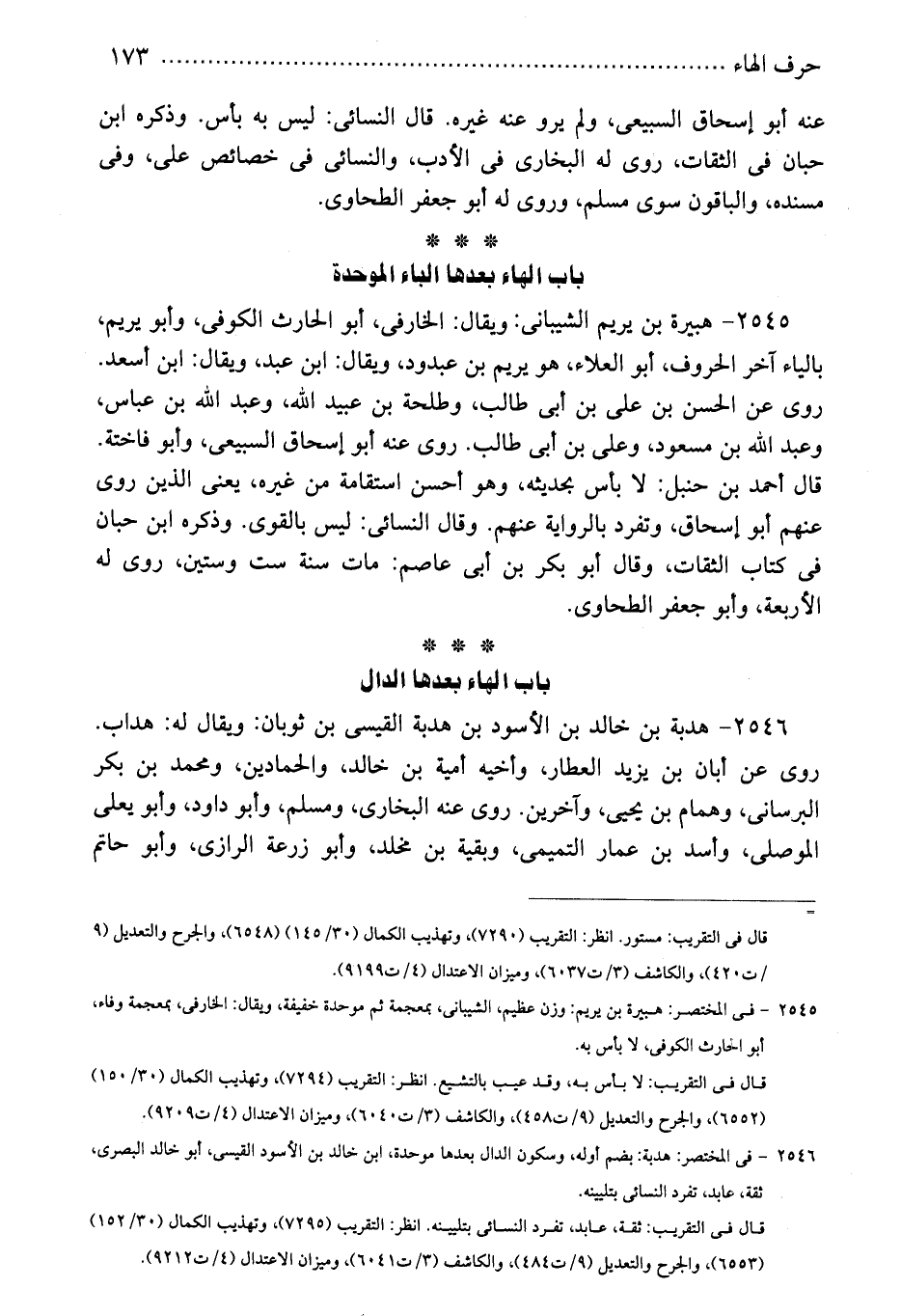 2546 - فى المختصر: هدبة: بضم أوله، وسكون الدال بعدها موحدة، ابن خالد بن الأسود القيسى، أبو خالد البصرى، ثقة، عابد، تفرد النسائى بتليينه.