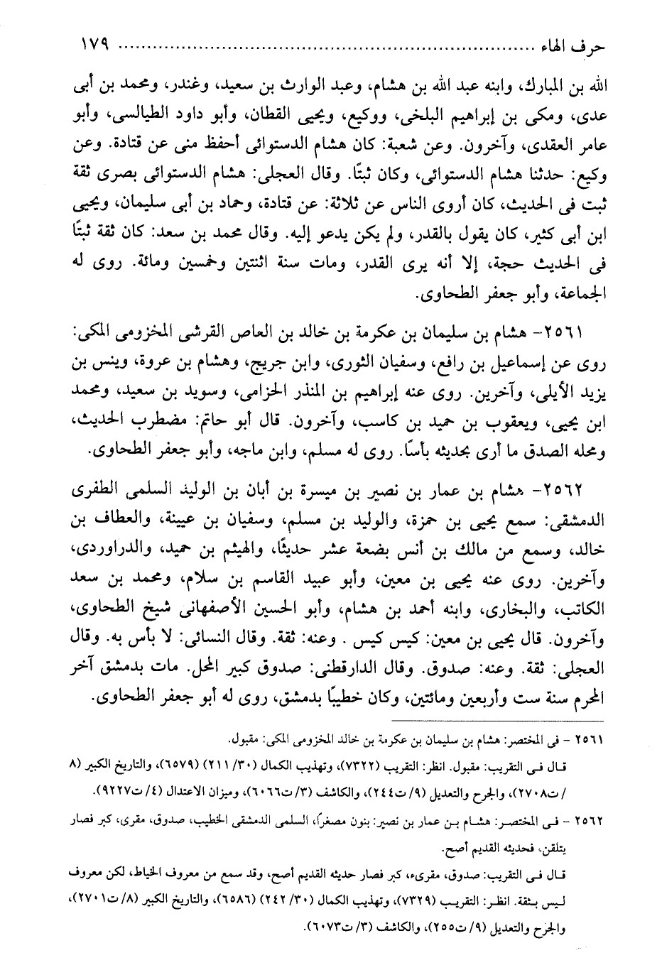 2562 - هشام بن عمار بن نصير بن ميسرة بن أبان بن الوليد السلمى الطفرى الدمشقى: سمع يحيى بن حمزة، والوليد بن مسلم، وسفيان بن عيينة، والعطاف بن خالد، وسمع من مالك بن أنس بضعة عشر حديثًا، والهيثم بن حميد، والدراوردى، وآخرين. روى عنه يحيى بن معين، وأبو عبيد القاسم بن سلام، ومحمد بن سعد الكاتب، والبخارى، وابنه أحمد بن هشام، وأبو الحسين الأصفهانى شيخ الطحاوى، وآخرون. قال يحيى بن معين: كيس كيس. وعنه: ثقة. وقال النسائى: لا بأس به. وقال العجلى: ثقة. وعنه: صدوق. وقال الدارقطنى: صدوق كبير المحل. مات بدمشق آخر المحرم سنة ست وأربعين ومائتين، وكان خطيبًا بدمشق، روى له أبو جعفر الطحاوى.
