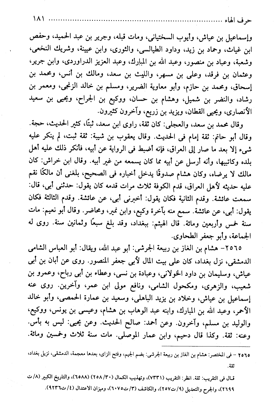 2565 - فى المختصر: هشام بن الغاز بن ربيعة الجرشى: بضم الجيم، وفتح الزاء، بعدها معجمة، الدمشقى، نزيل بغداد، ثقة.