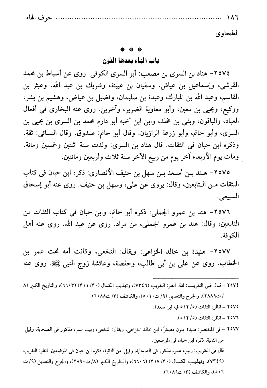 2574 - هناد بن السرى بن مصعب: أبو السرى الكوفى. روى عن أسباط بن محمد القرشى، وإسماعيل بن عياش، وسفيان بن عيينة، وشريك بن عبد الله، وعبثر بن القاسم، وعبد الله بن المبارك، وعبدة بن سليمان، وفضيل بن عياض، وهشيم بن بشر، ووكيع، ويحيى بن معين، وأبو معاوية الضرير، وآخرين. روى عنه البخارى فى أفعال العباد، والباقون، وبقى بن مخلد، وابن ابن أخيه أبو دارم محمد بن السرى بن يحيى بن السرى، وأبو حاتم، وأبو زرعة الرازيان. وقال أبو حاتم: صدوق. وقال النسائى: ثقة. وذكره ابن حبان فى الثقات. قال هناد بن السرى: ولدت سنة اثنتين وخمسين ومائة. ومات يوم الأربعاء آخر يوم من ربيع الآخر سنة ثلاث وأربعين ومائتين.
