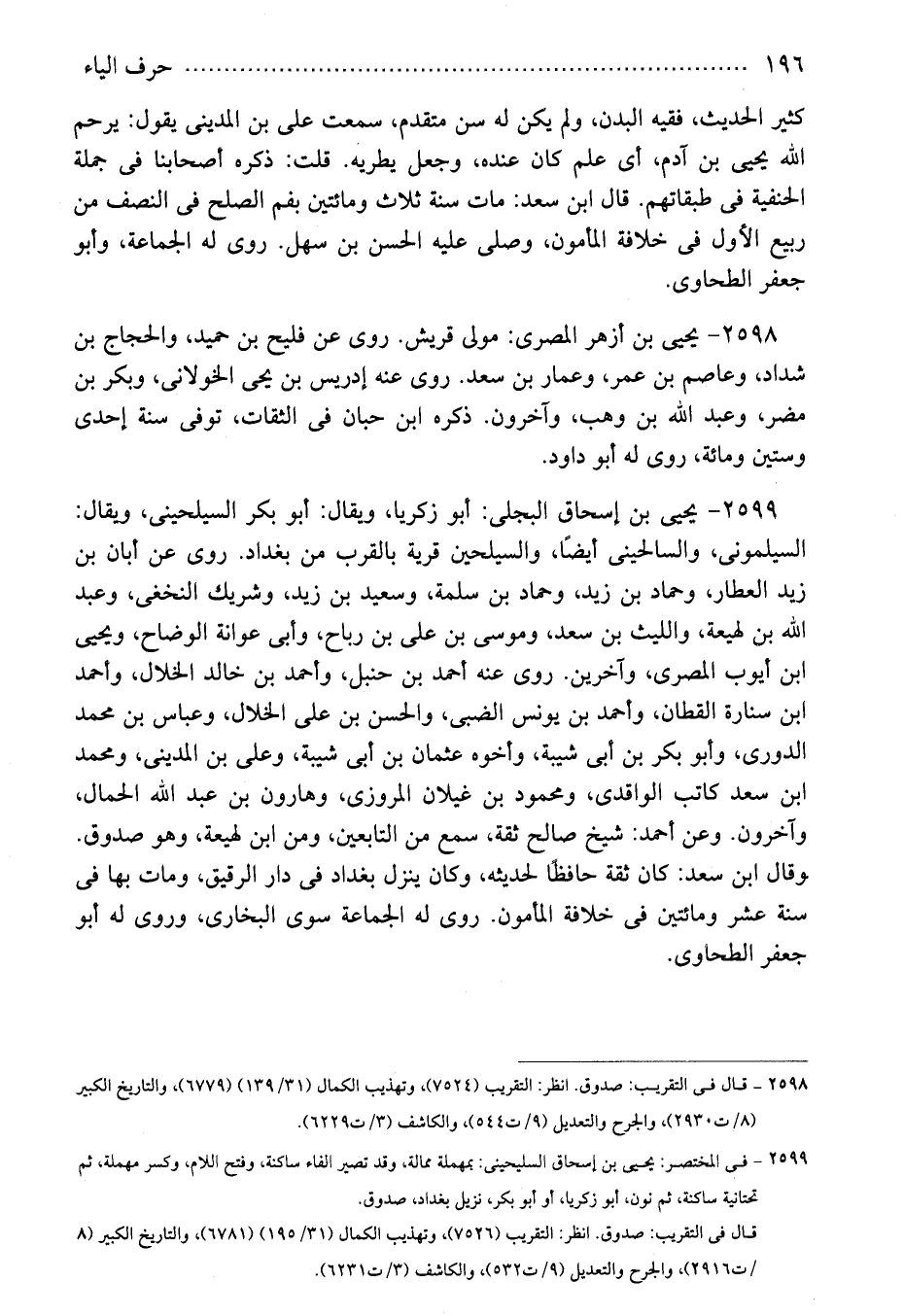 2599 - يحيى بن إسحاق البجلى: أبو زكريا، ويقال: أبو بكر السيلحينى، ويقال: السيلمونى، والسالحينى أيضًا، والسيلحين قرية بالقرب من بغداد. روى عن أبان بن زيد العطار، وحماد بن زيد، وحماد بن سلمة، وسعيد بن زيد، وشريك النخغى، وعبد الله بن لهيعة، والليث بن سعد، وموسى بن على بن رباح، وأبى عوانة الوضاح، ويحيى ابن أيوب المصرى، وآخرين. روى عنه أحمد بن حنبل، وأحمد بن خالد الخلال، وأحمد ابن سنارة القطان، وأحمد بن يونس الضبى، والحسن بن على الخلال، وعباس بن محمد الدورى، وأبو بكر بن أبى شيبة، وأخوه عثمان بن أبى شيبة، وعلى بن المدينى، ومحمد ابن سعد كاتب الواقدى، ومحمود بن غيلان المروزى، وهارون بن عبد الله الحمال، وآخرون. وعن أحمد: شيخ صالح ثقة، سمع من التابعين، ومن ابن لهيعة، وهو صدوق. وقال ابن سعد: كان ثقة حافظًا لحديثه، وكان ينزل بغداد فى دار الرقيق، ومات بها فى سنة عشر ومائتين فى خلافة المأمون. روى له الجماعة سوى البخارى، وروى له أبو جعفر الطحاوى.