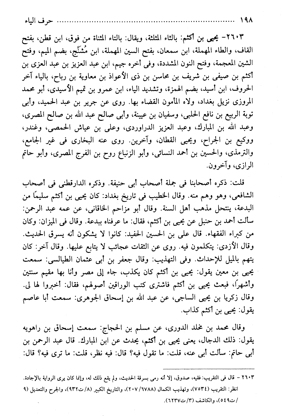 2603 - يحيى بن أكثم: بالثاء المثلثة، ويقال: بالتاء المثناة من فوق، ابن قطن، بفتح القاف، والطاء المهملة، ابن سمعان، بفتح السين المهملة، ابن مُشَنَّج، بضم الميم، وفتح الشين المعجمة، وفتح النون المشددة، وفى أخره جيم، ابن عبد العزيز بن عبد العزى بن أكثم بن صيفى بن شريف بن محاسن بن ذى الأعواذ بن معاوية بن رباح، بالياء آخر الحروف، ابن أسيد، بضم الهمزة، وتشديد الياء، ابن عمرو بن تميم الأسيدى، أبو محمد المروزى نزيل بغداد، ولاه المأمون القضاء بها. روى عن جرير بن عبد الحميد، وأبى توبة الربيع بن نافع الحلبى، وسفيان بن عيينة، وأبى صالح عبد الله بن صالح المصرى، وعبد الله بن المبارك، وعبد العزيز الدراوردى، وعلى بن عياش الحمصى، وغندر، ووكيع بن الجراح، ويحيى القطان، وآخرين. روى عنه البخارى فى غير الجامع، والترمذى، والحسين بن أحمد النسائى، وأبو الزنباع روح بن الفرج المصرى، وأبو حاتم الرازى، وآخرون.
