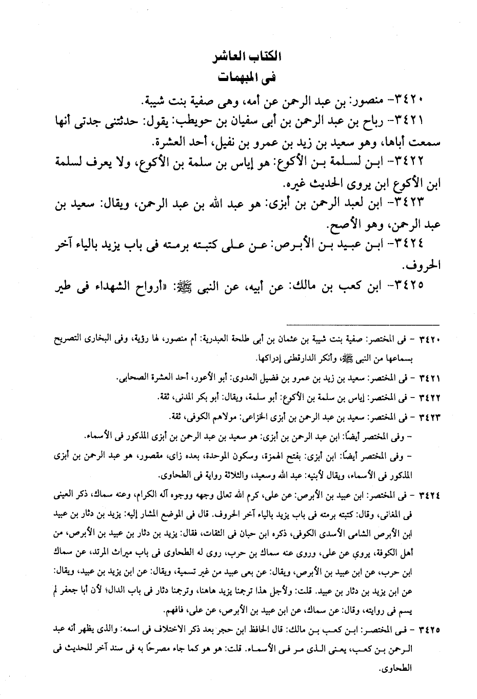 3425 - فى المختصر: ابن كعب بن مالك: قال الحافظ ابن حجر بعد ذكر الاختلاف فى اسمه: والذى يظهر أنه عبد الرحمن بن كعب، يعنى الذى مر فى الأسماء. قلت: هو هو كما جاء مصرحًا به فى سند آخر للحديث فى الطحاوى.