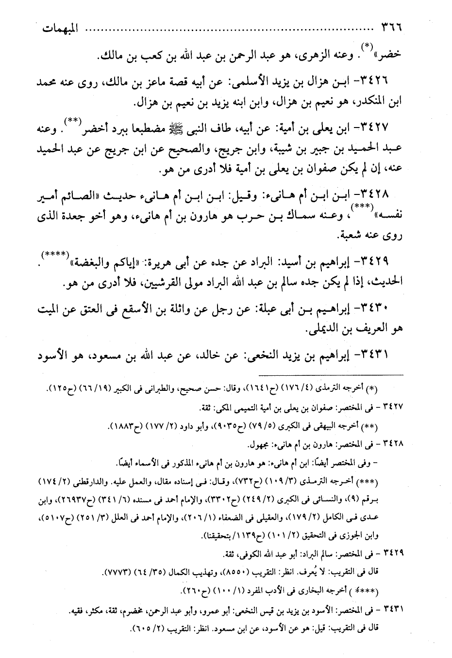 3428 - ابن ابن أم هانىء: وقيل: ابن ابن أم هانىء حديث "الصائم أمير نفسه" (*) ، وعنه سماك بن حرب هو هارون بن أم هانىء، وهو أخو جعدة الذى روى عنه شعبة.