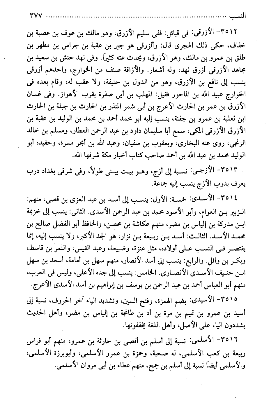 3513 - الأزجى: نسبة إلى أزج، وهو بيت يبنى طولاً، وفى شرقى بغداد درب يعرف بدرب الأزج ينسب إليه جماعة.