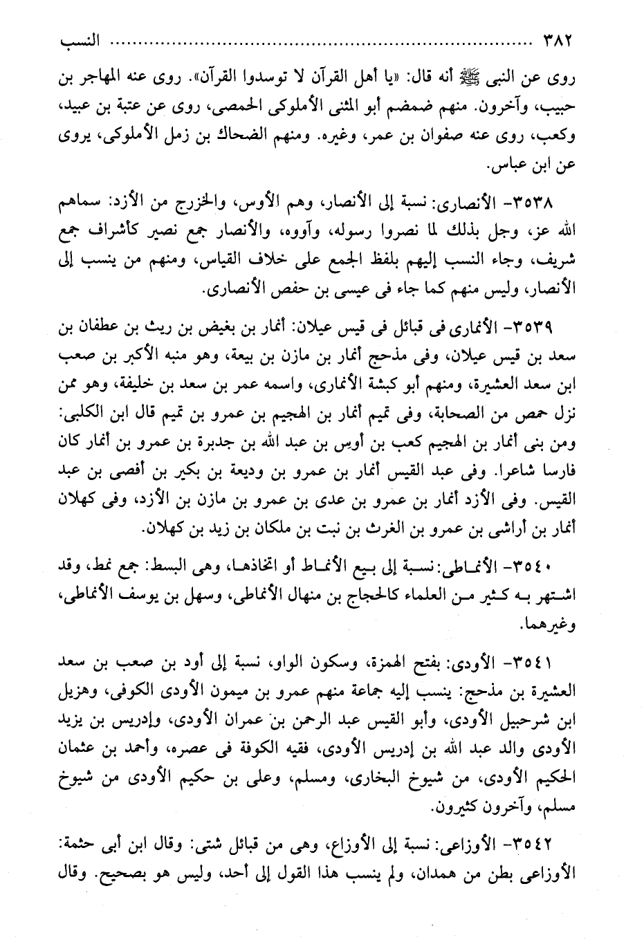 3542 - الأوزاعى: نسبة إلى الأوزاع، وهى من قبائل شتى: وقال ابن أبى حثمة: الأوزاعى بطن من همدان، ولم ينسب هذا القول إلى أحد، وليس هو بصحيح. وقال