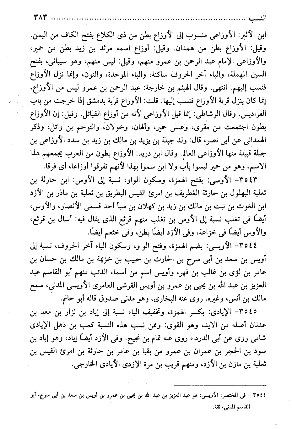 3543 - الأوسى: بفتح الهمزة، وسكون الواو، نسبة إلى الأوس: ابن حارثة بن ثعلبة البهلول بن حارثة الغطريف بن امرئ القيس البطريق بن ثعلبة بن ماذر بن الأزد ابن الغوث بن نبت بن مالك بن زيد بن كهلان بن سبأ أحد قسمى الأنصار، والأوس، أيضًا فى تغلب نسبة إلى الأوس بن تغلب منهم قرثع الذى يقال فيه: أسال بن قرثع، والأوس أيضًا فى خزاعة، وفى الأزد أيضًا بطن، وفى خثعم أيضًا.