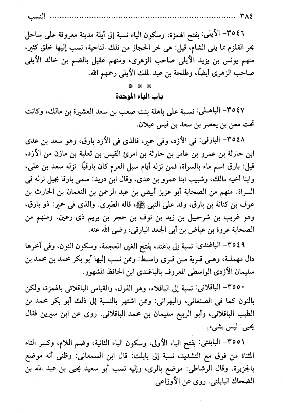 3547 - الباهلى: نسبة على باهلة بنت صعب بن سعد العشيرة بن مالك، وكانت تحت معن بن يعصر بن سعد بن قيس عيلان.