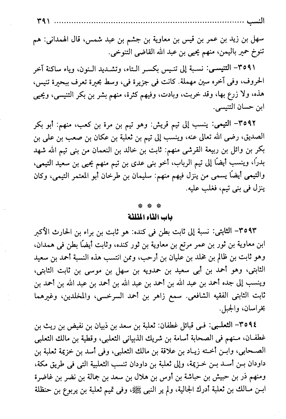 3592 - التيمى: ينسب إلى تيم قريش: وهو تيم بن مرة بن كعب، منهم: أبو بكر الصديق، رضى الله تعالى عنه، وينسب إلى تيم بن ثعلبة بن عكان بن صعب بن على بن بكر بن وائل بن ربيعة القرشى منهم: ثابت بن خالد بن النعمان من بنى تيم الله شهد بدرًا، وينسب أيضًا إلى تيم الرباب، أخو بنى عدى بن تيم منهم يحيى بن سعيد التيمى، والتيمى أيضًا يسمى من ينزل فيهم منهم: سليمان بن طرخان أبو المعتمر التيمى، وكان ينزل فى بنى تيم، فغلب عليه.
