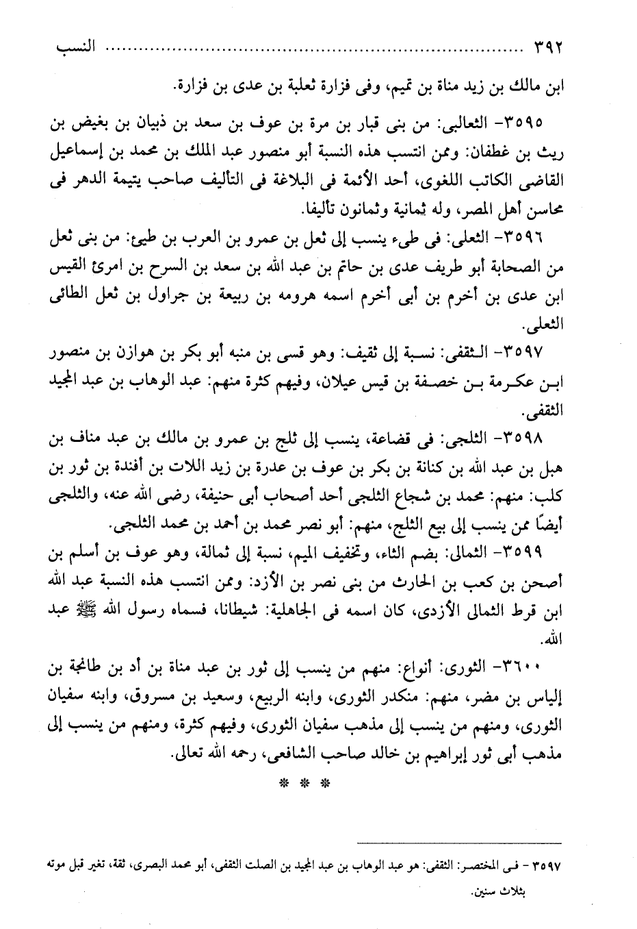 3596 - الثعلى: فى طىء ينسب إلى ثعل بن عمرو بن العرب بن طيئ: من بنى ثعل من الصحابة أبو طريف عدى بن حاتم بن عبد الله بن سعد بن السرح بن امرئ القيس بن عدى بن أخرم بن أبى أخرم اسمه هرومه بن ربيعة بن جراول بن ثعل الطائى الثعلى.