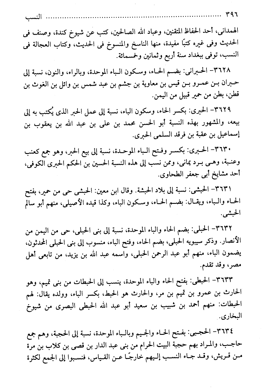 3628 - الحبرانى: بضم الحاء، وسكون الباء الموحدة، وبالراء، والنون، نسبة إلى حبران بن عمرو بن قيس بن معاوية بن جشم بن عبد شمس بن وائل بن الغوث بن قطن، بطن من حمير قبيل من اليمن.