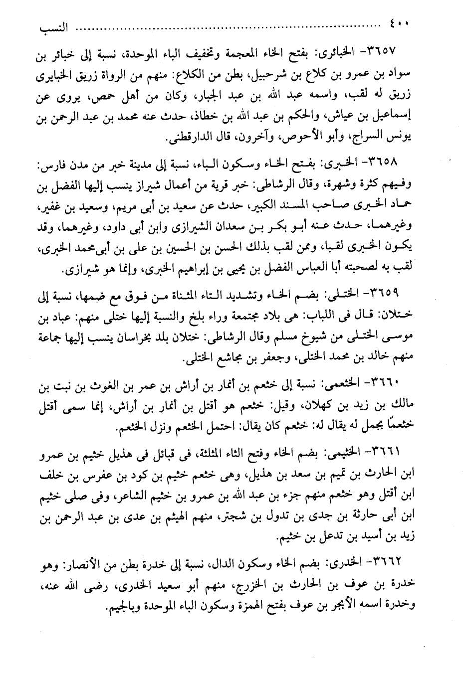 3658 - الخبرى: بفتح الخاء وسكون الباء، نسبة إلى مدينة خبر من مدن فارس: وفيهم كثرة وشهرة، وقال الرشاطى: خبر قرية من أعمال شيزار ينسب إليها الفضل بن حماد الخبرى صاحب المسند الكبير، حدث عن سعيد بن أبى مريم، وسعيد بن غفير، وغيرهما، حدث عنه أبو بكر بن سعدان الشيرازى وابن أبى داود، وغيرهما، وقد يكون الخبرى لقبا، وممن لقب بذلك الحسن بن الحسين بن على بن أبىمحمد الخبرى، لقب به لصحبته أبا العباس الفضل بن يحيى بن إبراهيم الخبرى، وإنما هو شيزارى.