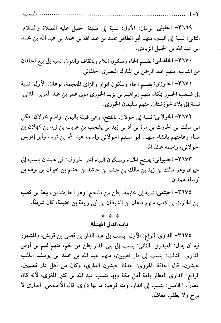 3669 - الخليلى: نوعان: الأول: نسبة إلى مدينة الخليل عليه الصلاة والسلام. الثانى: نسبة إلى البدو، منهم أبو الطاهر محمد بن عبد الله بن محمد بن عبد الله بن محمد ابن عبد الله بن الخليل الزيادى.
