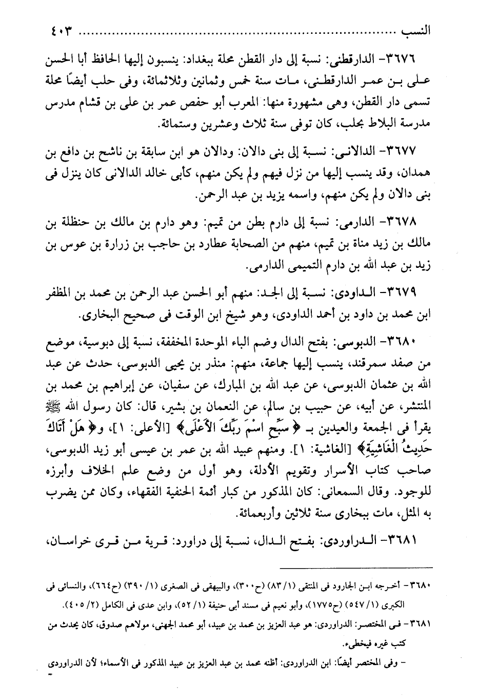 3678 - الدارمى: نسبة إلى دارم بطن من تميم: وهو دارم بن مالك بن حنظلة بن مالك بن زيد مناة بن تميم، منهم من الصحابة عطارد بن حاجب بن زرارة بن عوس بن زيد بن عبد الله بن دارم التميمى الدارمى.